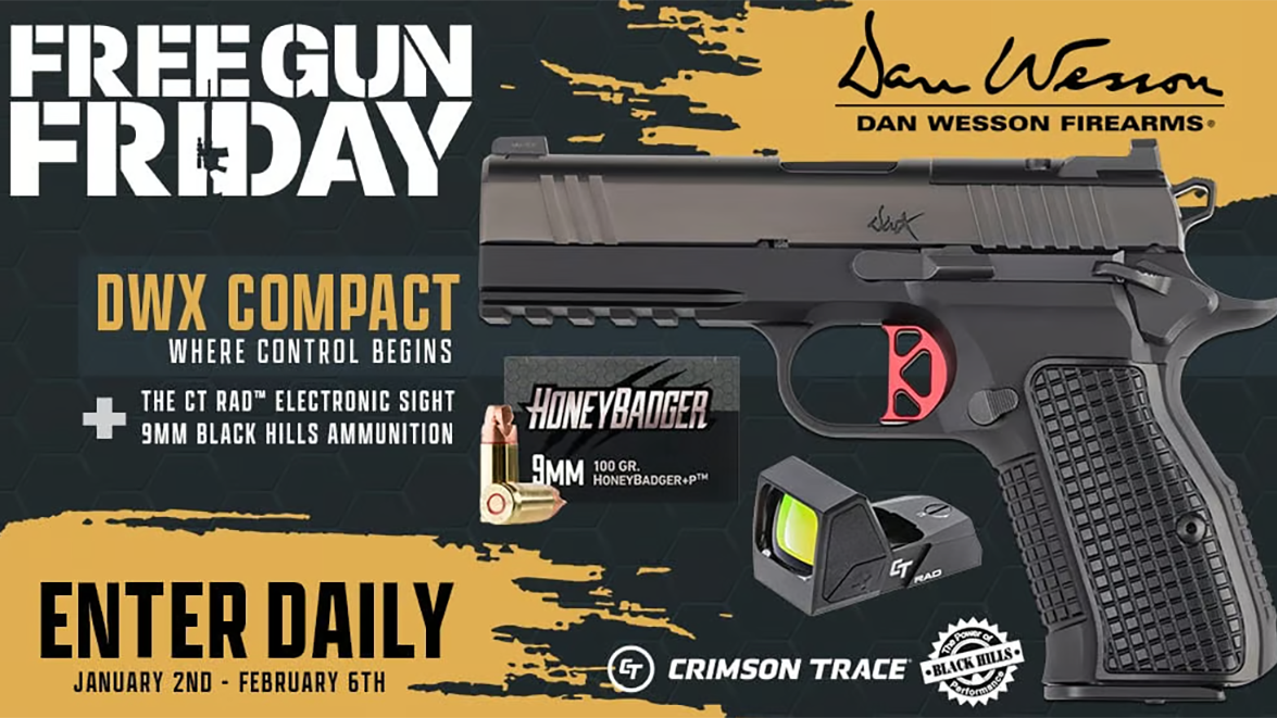 Jan22026 January's Free Gun Friday: Dan Wesson DWX Compact, Crimson Trace CT Rad, and Black Hills Ammunition If the contest is not loading, Click Here Category: UncategorizedJanuary 2, 2026 Share this post Share on FacebookShare on Facebook Share on XShare on X Post navigationPreviousPrevious post:Gunday Brunch 207 – Holiday Gift GuideRelated PostsDecember Free Gun Friday: Q’s Sugar Weasel, Armasight Jockey 320, And Black Hills AmmunitionDecember 5, 2025It Takes 22 To TangoNovember 12, 2025